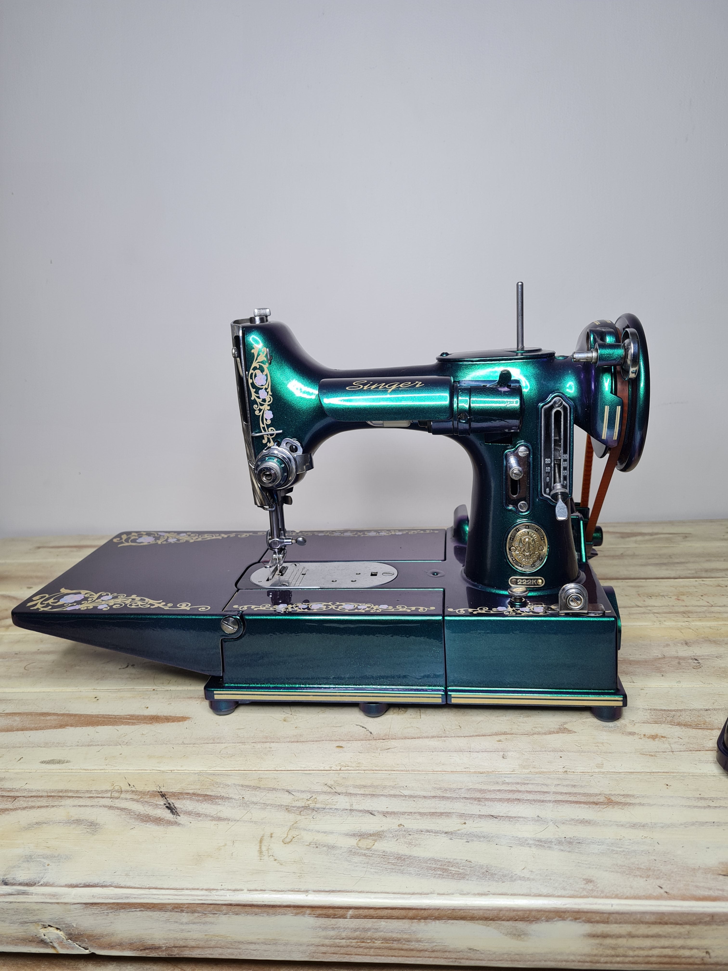 This beauty has a the standard Singer 221K Featherweight decals applied in black.